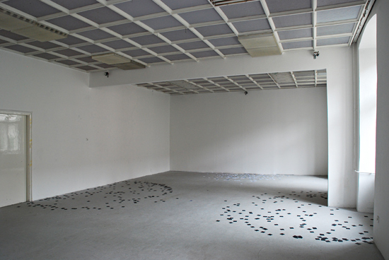 Zwei der Automaten wurden mit schwarzen Zetteln, als Farbkontrast zur vorhandenen Farbigkeit des Architektonischen Raumes bestückt. Als schwarze Zeichnungen verteilen sie sich rhythmisch auf dem Galerieboden.