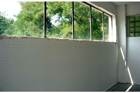 Während einer mehrtägigen Aktion beginne ich an einer Stelle die Wände des ca. 50 Quadratmeter Großen Ausstellungsraumes mit einem Bleistift zu beschreiben. Der Raum wird 10mal von mir umrundet, wobei das Schriftbild nach und nach schwächer wird. Zehn verschlossene und befüllte Dokumentenmappen verbleiben auf dem Ausstellungsboden.