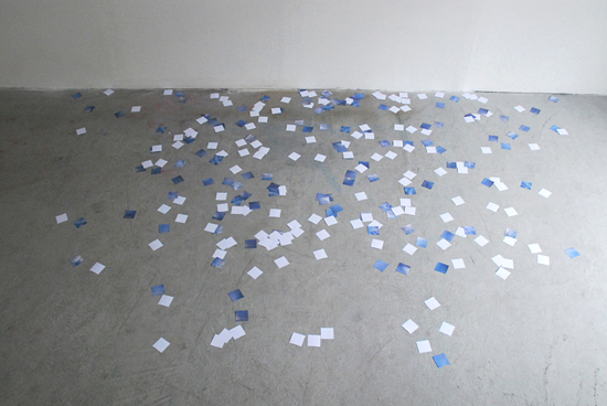 Zwei der Automaten wurden mit schwarzen Zetteln, als Farbkontrast zur vorhandenen Farbigkeit des Architektonischen Raumes bestückt. Als schwarze Zeichnungen verteilen sie sich rhythmisch auf dem Galerieboden.